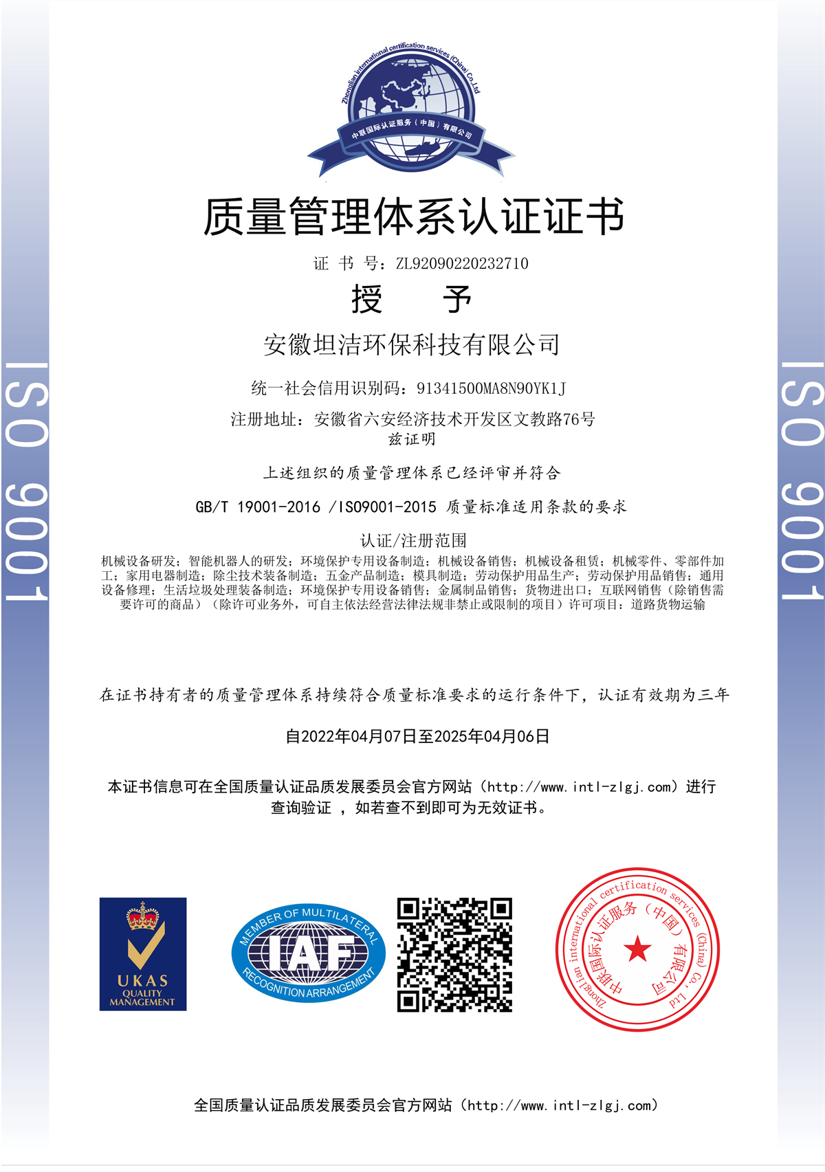 南川质量管理体系认证证书